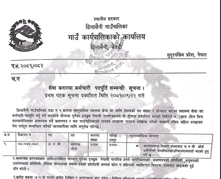 डिलासैनी गाउँपालिकामा अ.न.मी. आवश्यकता सम्बन्धी सूचना