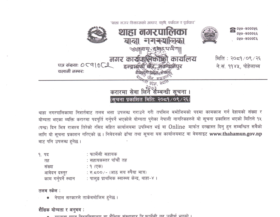 थाहा नगरपालिकामा फार्मेसी सहायक आवश्यकता सम्बन्धी सूचना