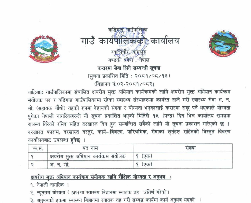 बडिगाड गाउँपालिका बागलुङमा कर्मचारी आवश्यकता सम्बन्धी सूचना