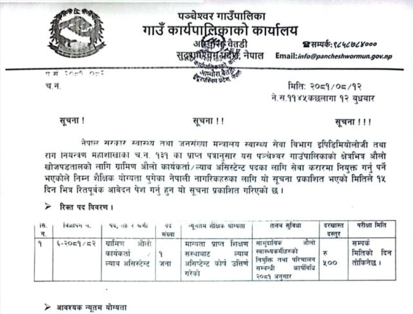 पञ्चेश्वर गाउँपालिका बैतडीमा ल्याब असिष्टेन्ट करार सेवामा पदपूर्ती गर्ने सम्बन्धी सूचना