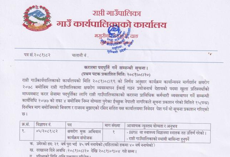राप्ती गाउँपालिकादाङ्गमा क्षयरोग मुक्त अभियान कार्यक्रम संयोजकको करारमा पदपूर्ति गर्ने सम्बन्धी सूचना ।