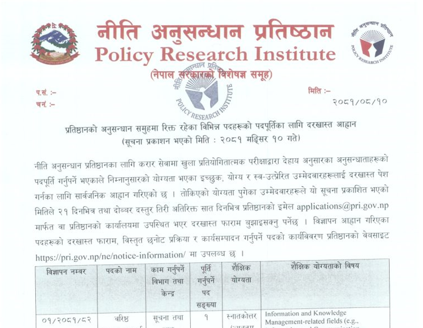 नीति अनुसन्धान प्रतिष्ठानको अनुसन्धान समूहमा रिक्त रहेका विभिन्न पदहरूको पदपूर्तिका लागि दरखास्त आह्वान