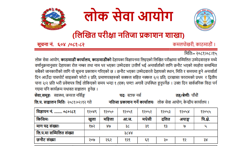 लोक सेवा आयोग, काठमाडौं कार्यालयको बिज्ञापन नं १२०४९-१२०५५/०८०-८१ (खुला/समावेशी), स्वास्थ्य सेवा, जनरल नर्सिङ्ग समूह, पाँचौ तह, स्टाफ नर्स पदको लिखित नतिजा