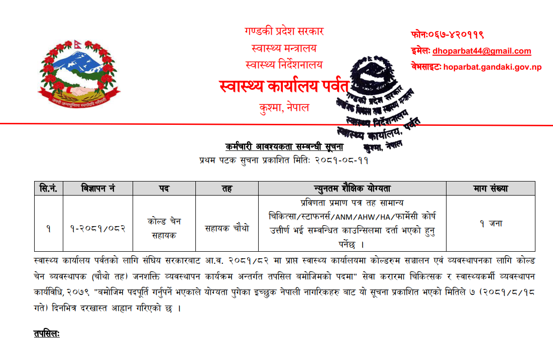 स्वास्थ्य कार्यालय पर्वतमा Cold Chain Assistant आवश्यकता सम्बन्धी सूचना !