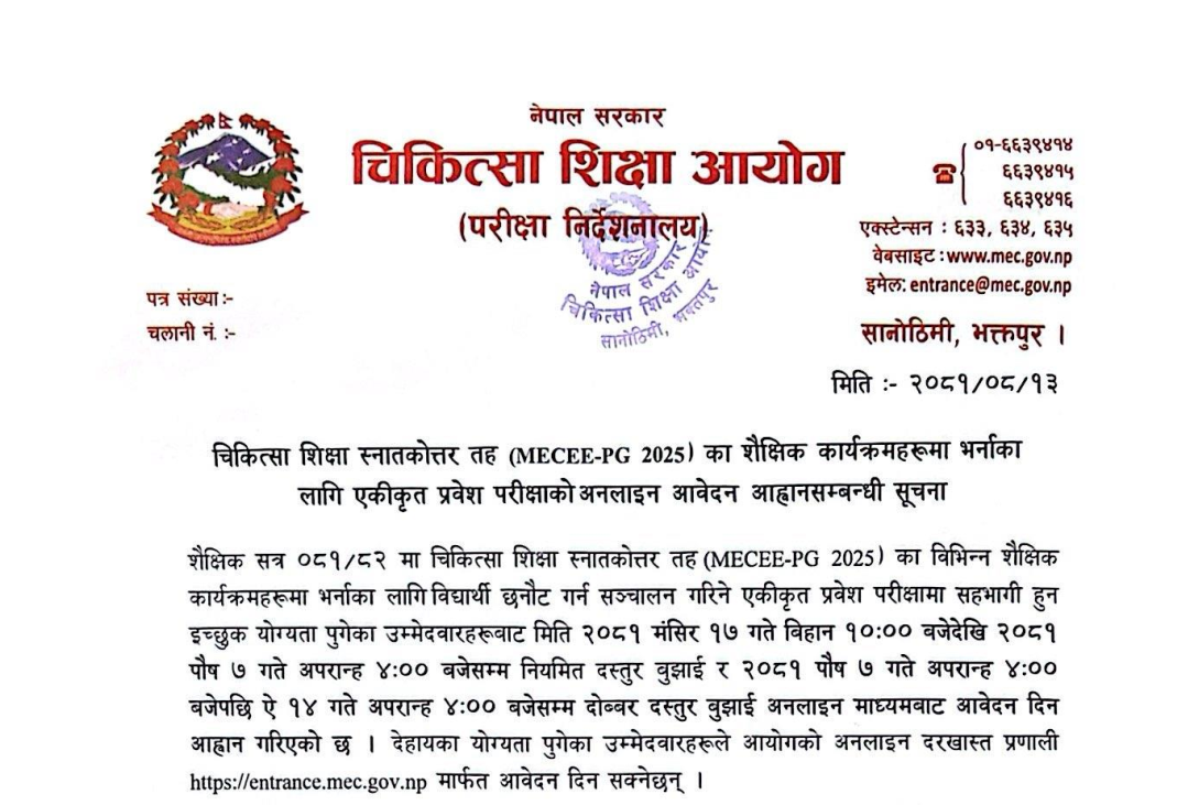 चिकित्सा शिक्षा स्नातकोत्तर तह (MECEE-PG 2025) का शैक्षिक कार्यक्रमहरूमा भर्नाका लागि एकीकृत प्रवेश परीक्षाको अनलाइन आवेदन आह्वानसम्बन्धी सूचना