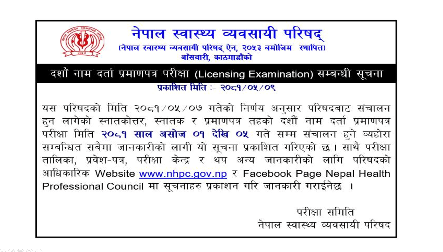 NHPC को दशौं नाम दर्ता प्रमाणपत्र परीक्षा सम्बन्धी सूचना !