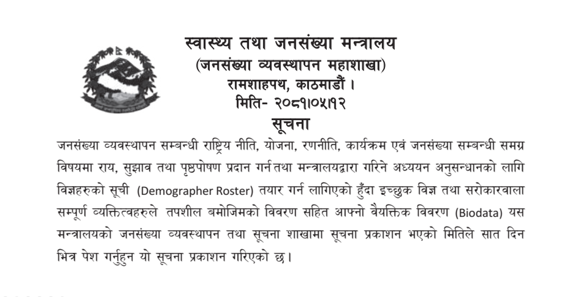 स्वास्थ्य तथा जनसंङ्ख्या मन्त्रालयको विज्ञसूची (Demographer Roster) को लागि निवेदन दर्ता गर्नेसम्बन्धी सूचना