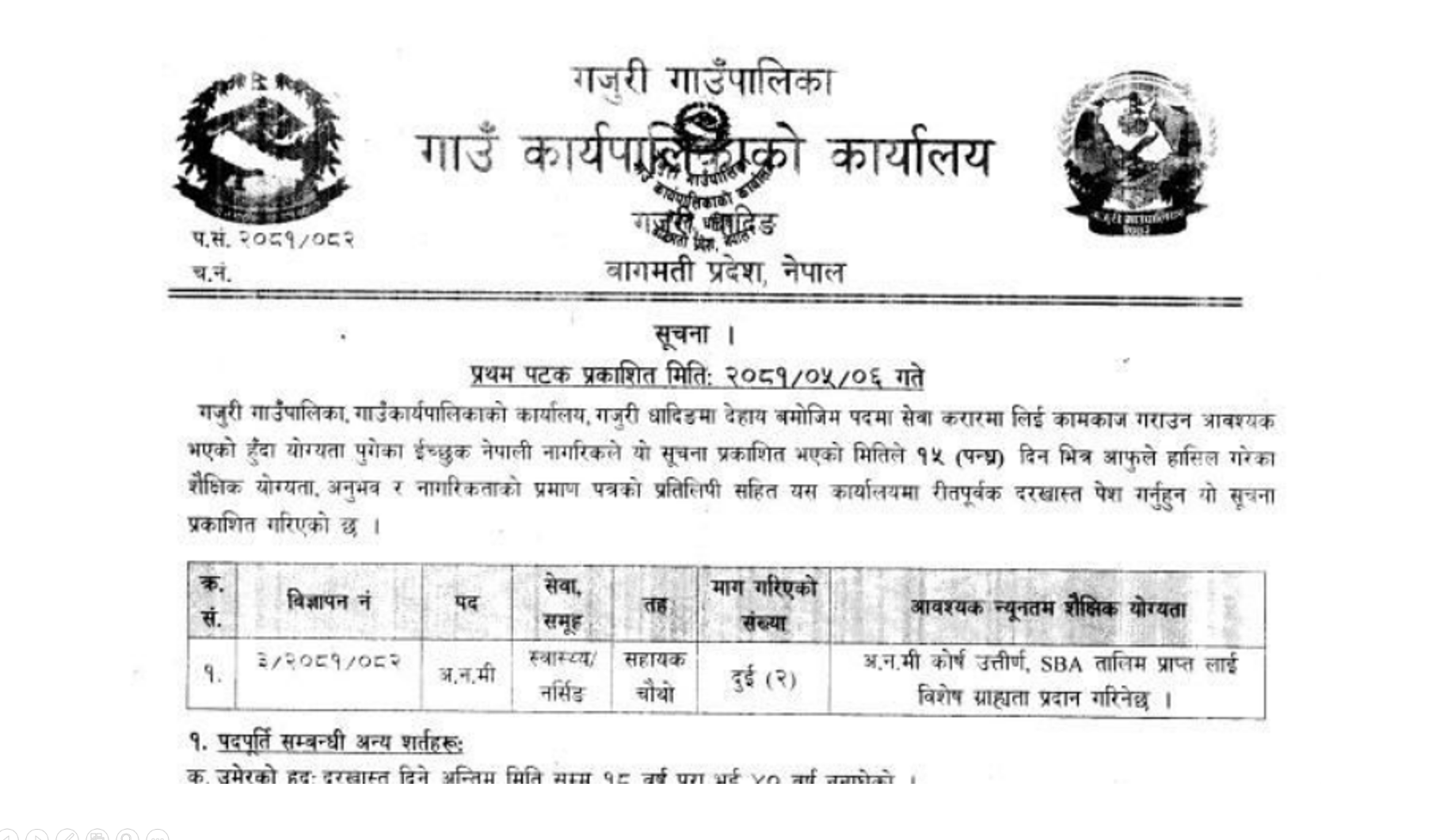 Vacancy Announcement For ANM At Gajuri Rural Municipality, Dhading